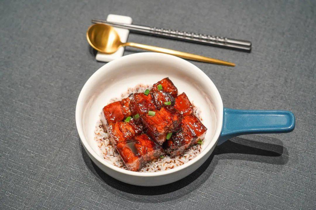 作为本帮家常菜中的王牌,怎么把这道红烧肉做出记忆点尤为关键。苦思冥想下,帅大厨遵循“脂肪配碳水”的经典法则,取三层肥润五花,烧熟后均匀裹上糖色,铺于五常大米饭上。