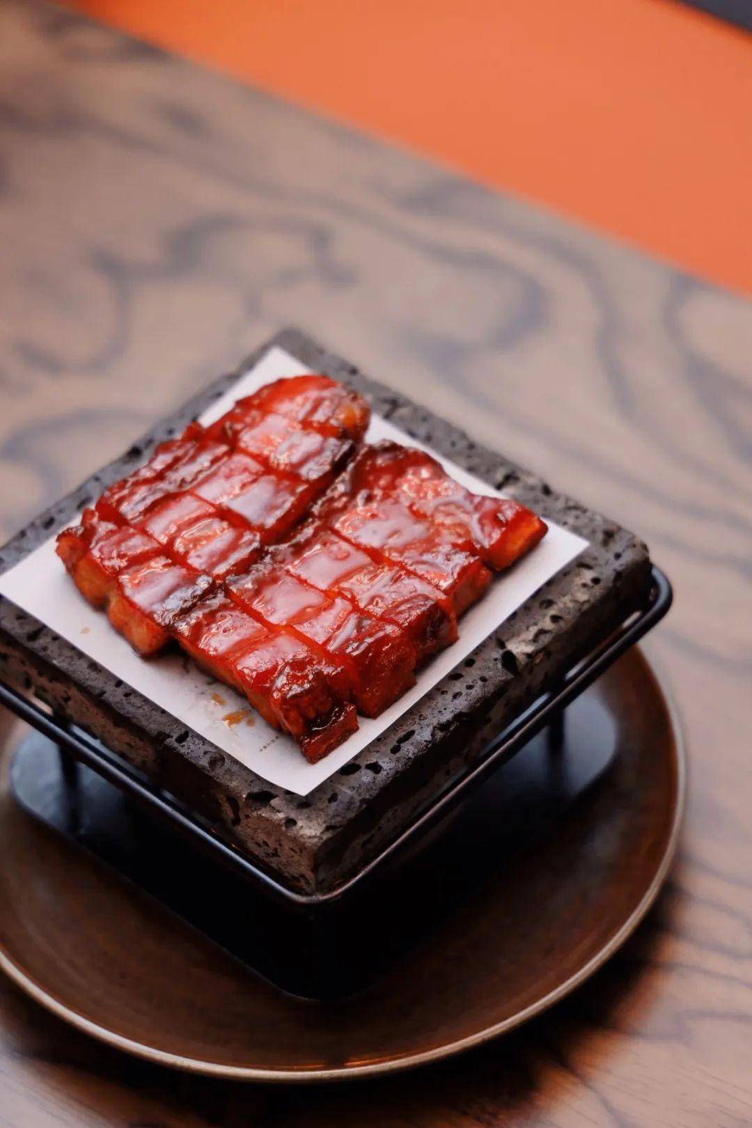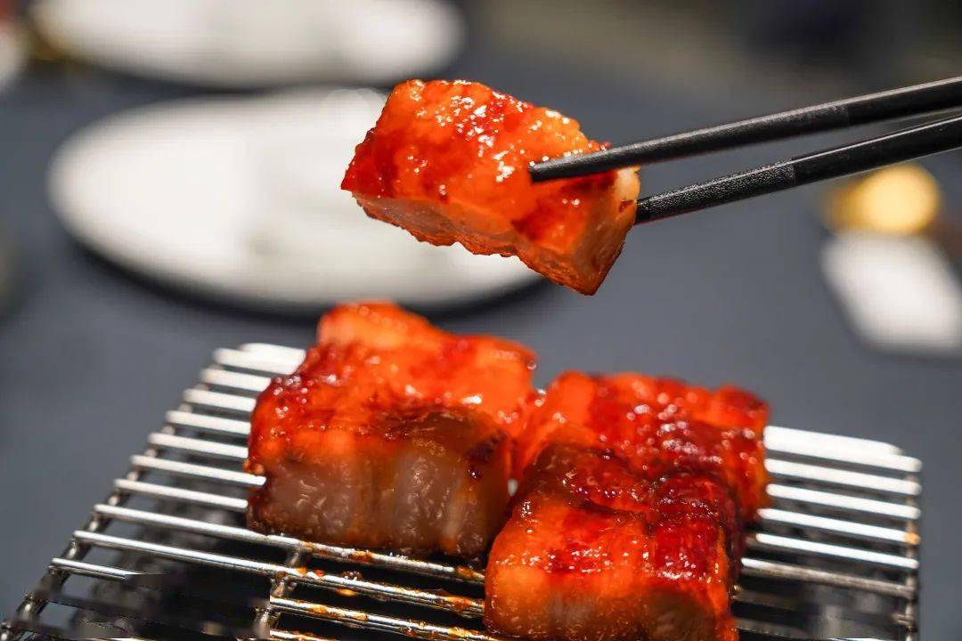 红润油亮的叉烧肉上桌散发着诱人的香气,以加入朗姆酒的酱汁腌渍而成,香甜滋味更加醇厚。叉烧肥、瘦均衡的质感刚刚好,外层微焦甜润,内里软嫩多汁,咸甜适宜,令人回味无穷。