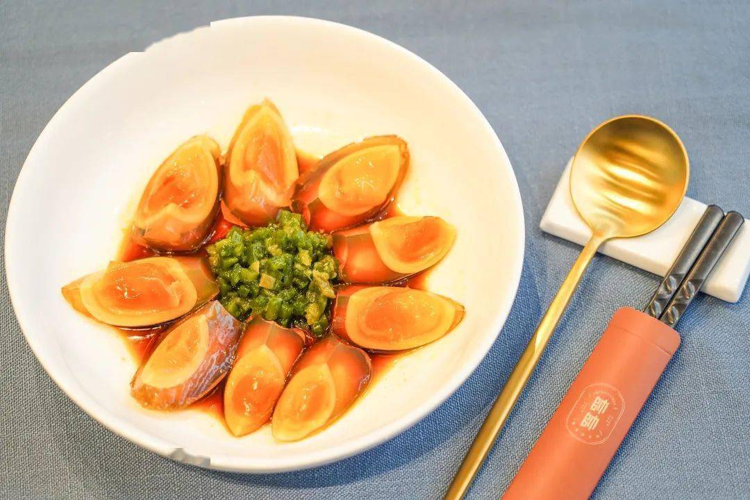 选用广西北海海鸭蛋制成皮蛋,使其外观和口感更上一层楼。皮蛋通体泛着秋叶黄的色泽,晶莹透亮,溏心蛋黄柔软绵密,去除了传统皮蛋特有的重金属味。顶部一抹葱绿烧椒酱,微微的辣意令人胃口大开。
