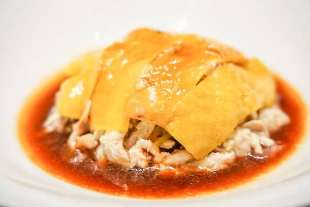 色泽金黄的盐焗鸡闪着诱人的光亮,薄薄的皮层爽滑Q弹,肉质鲜嫩,汁水充盈,经过盐焗后咸香味道渗入深层肌理,入口有淡淡的清香。底部铺散着一层花生芽,清脆微甜,巧妙的食材搭配与甜口酱汁相得益彰,带来唇齿间的惊喜碰撞。