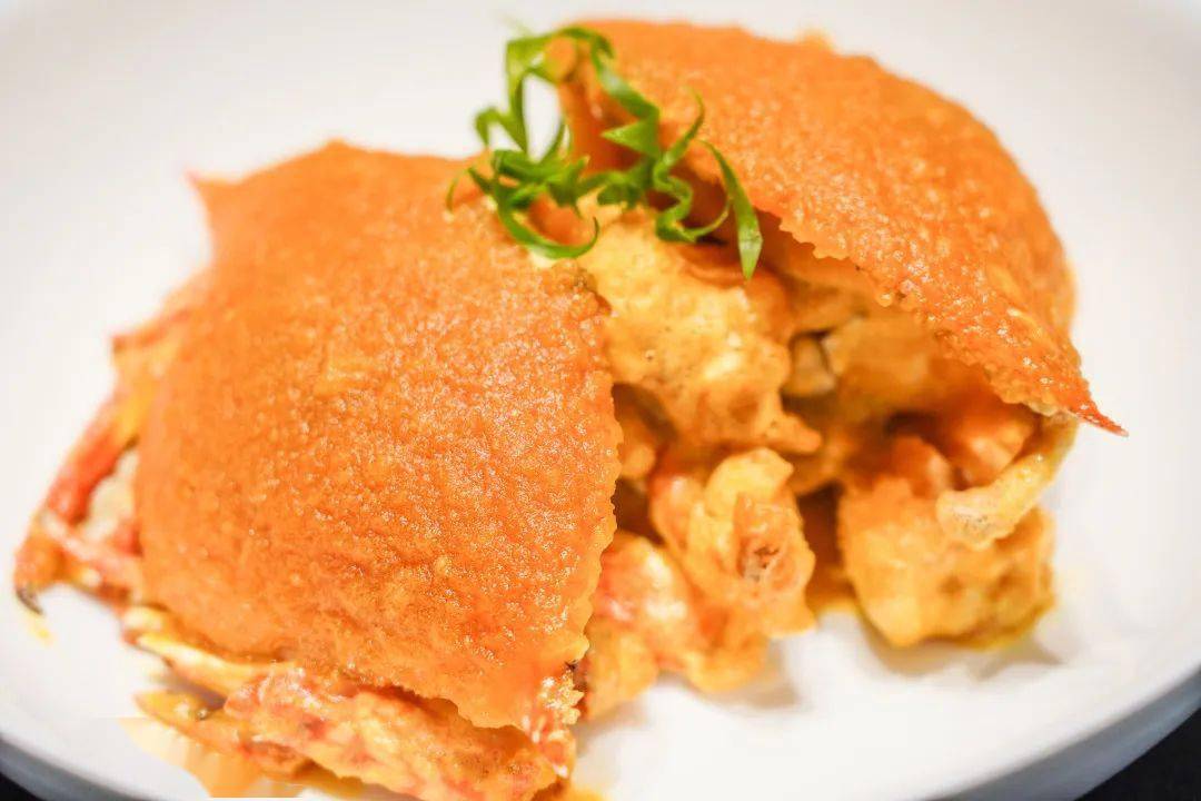 个头肥硕的梭子蟹肉多味美,沾上一层薄薄的淀粉入锅油炸,火候拿捏得当,将外壳炸得酥脆,再裹上一层松沙可口的咸蛋黄,增加蟹的香感,浓郁香气霎时扑鼻而来。咬开香脆的外壳,蟹肉雪白滑嫩,丝丝清甜,简直让人欲罢不能。