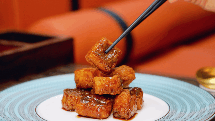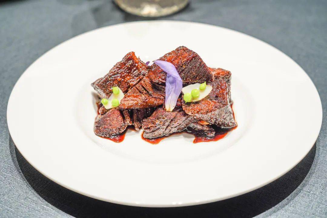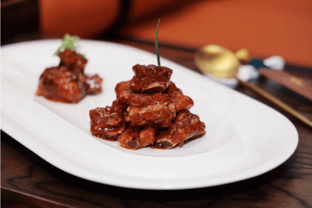 澳洲黑标雪花牛小排经过高温过油,形成一层酥脆表皮,裹满浓醇酱汁。咬开后内里牛小排肉质细致紧密,十分柔嫩,并迸发出饱满的汁水。一脆一柔,形成口感的对比,丰腴的香气瞬时充斥整个口腔。