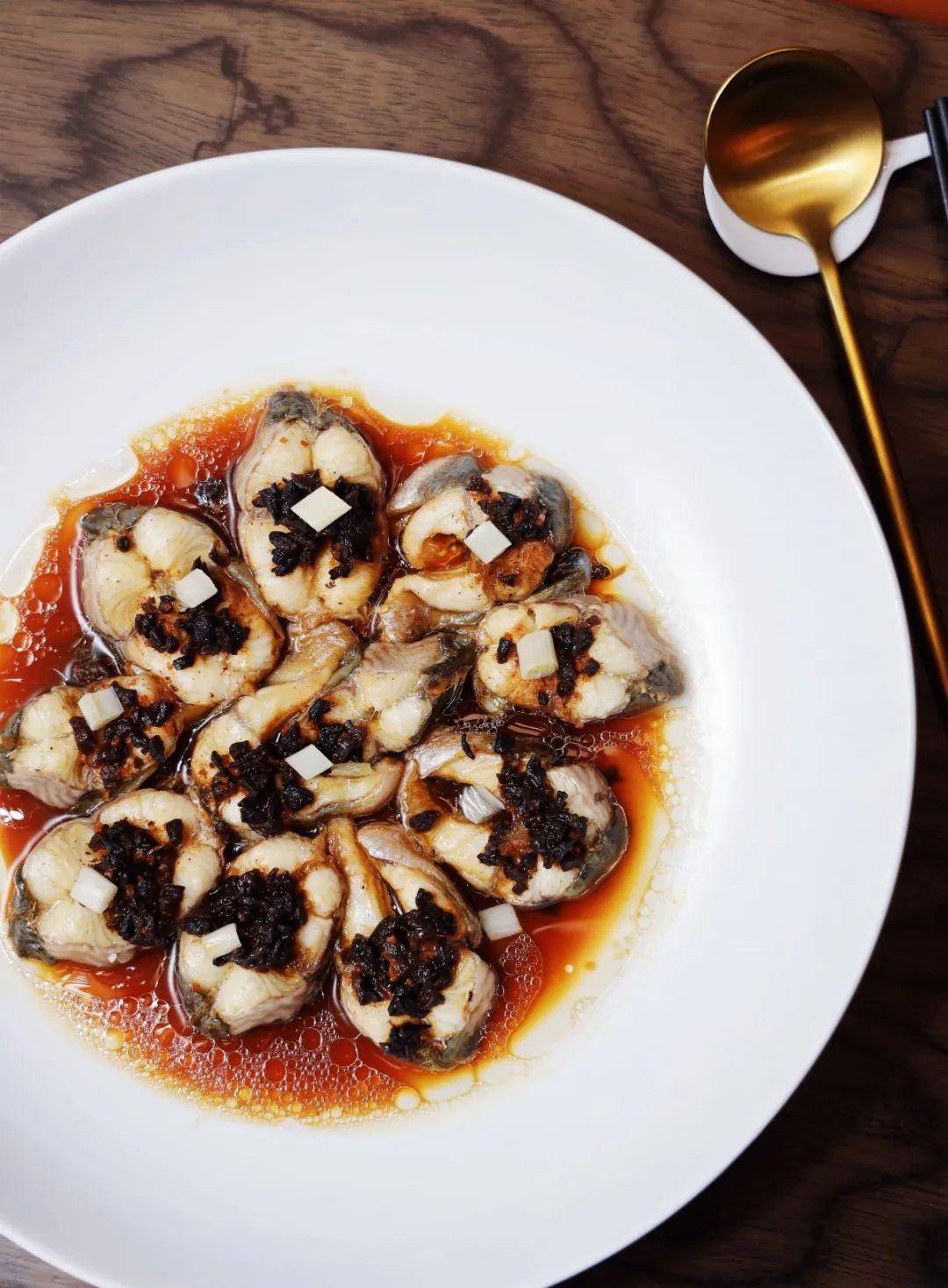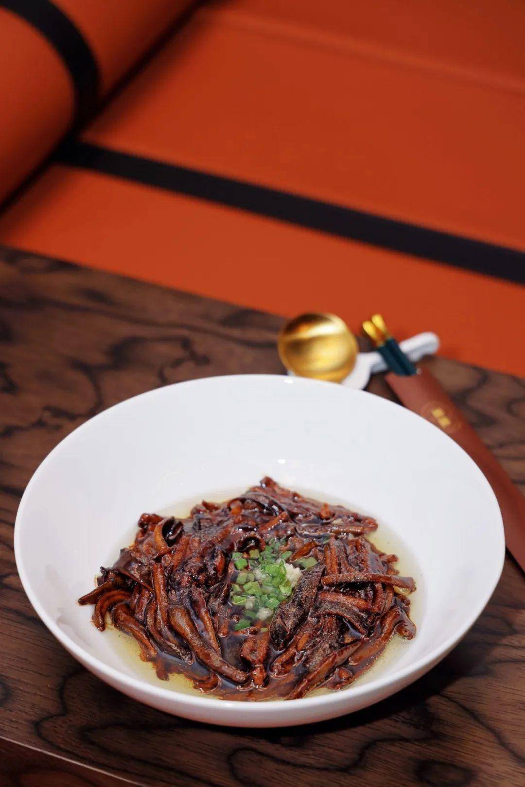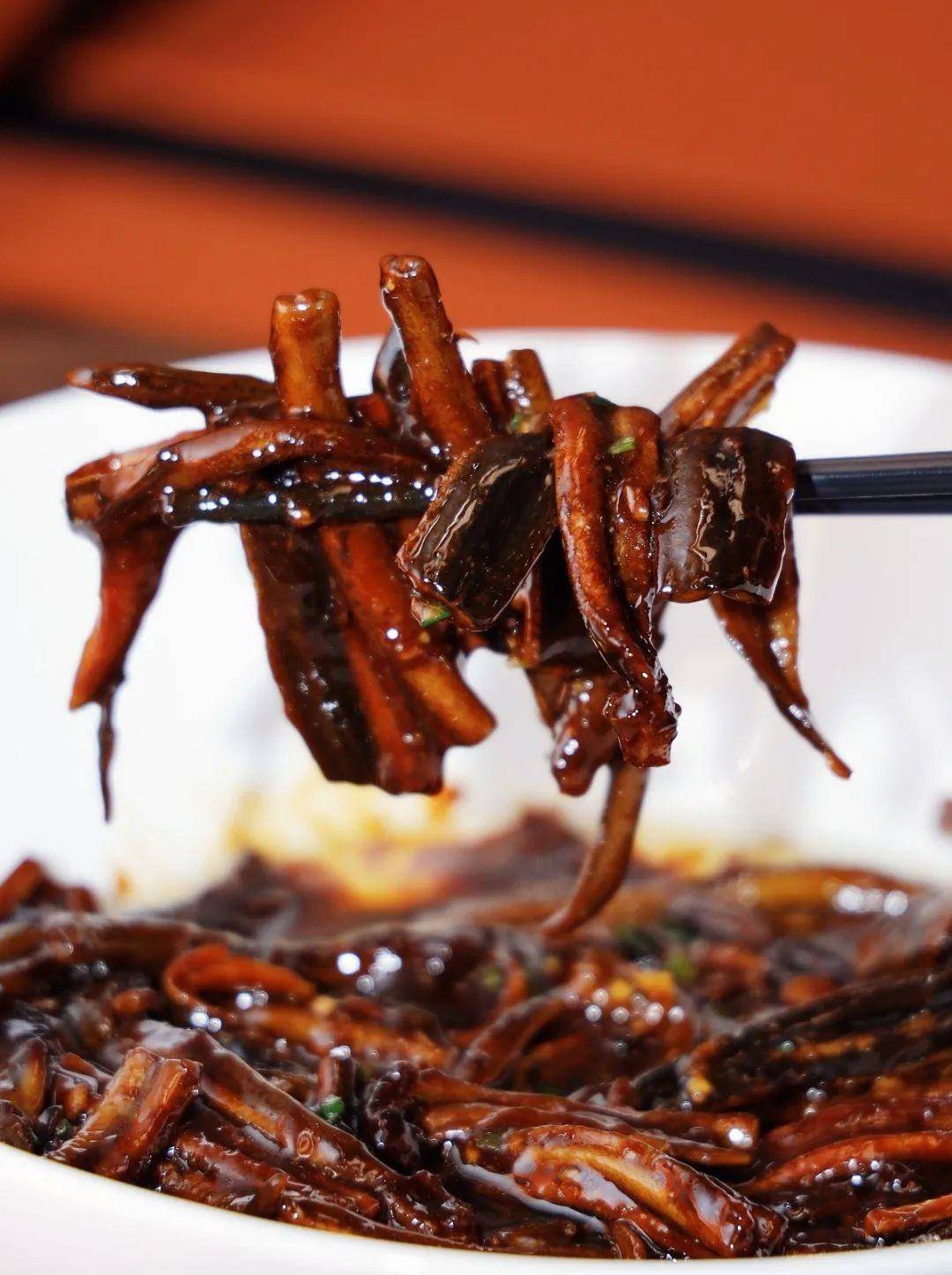存放多年的潮州老菜脯,愈老愈有味道,香气独特。精心挑选肉质丰腴的无锡太湖金丝鳗,与菜脯一同红烧,酱香四溢。鳗鱼细腻嫩滑,裹满酱汁,入口即化,且融入了老菜脯的精华,带来舌尖新体验。