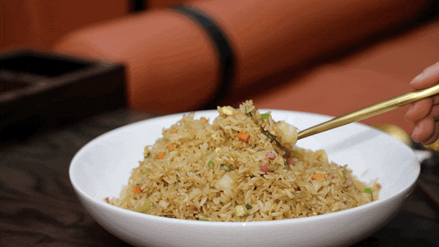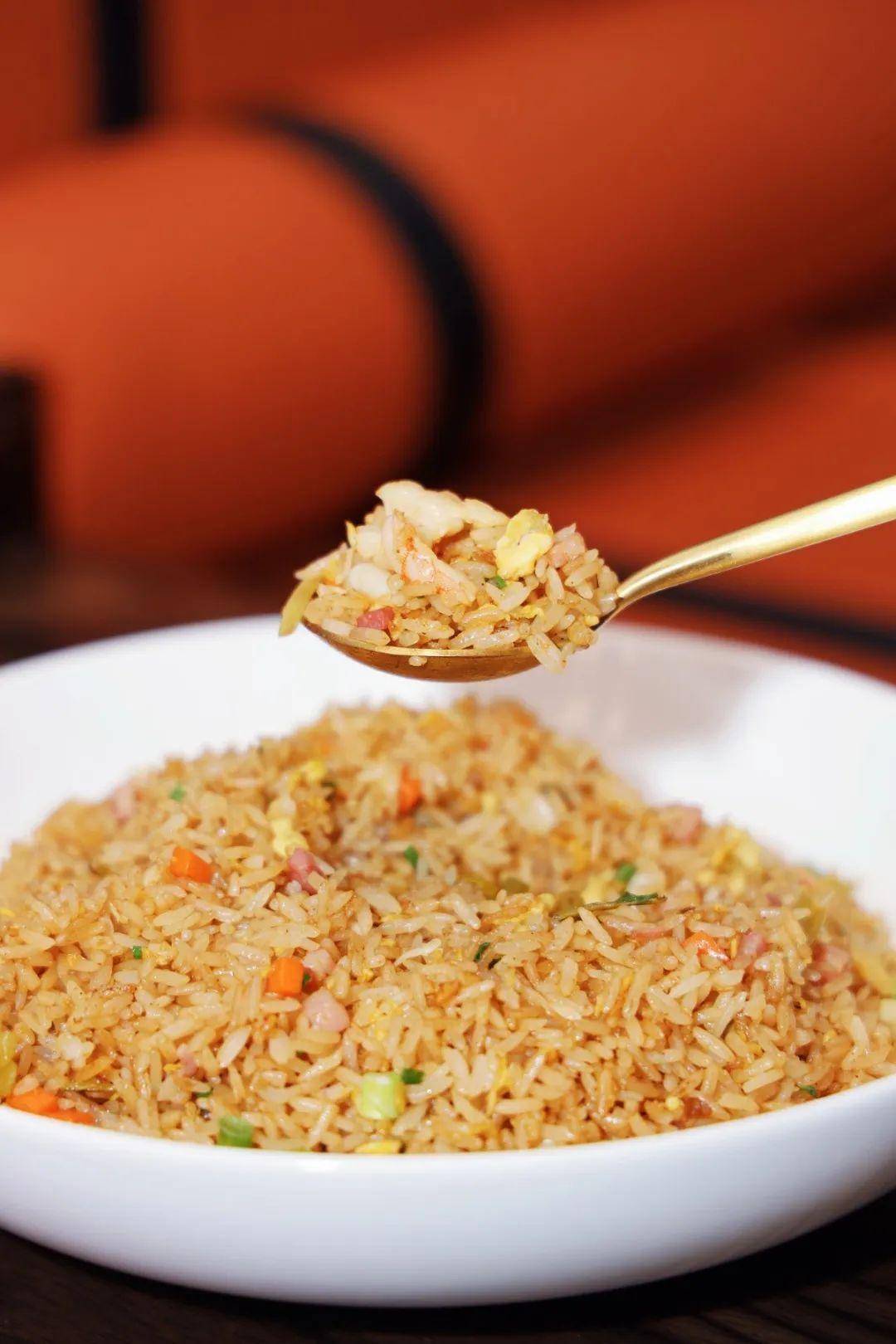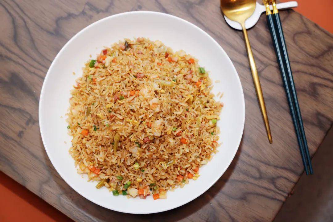 舀起一大勺炒饭趁热送入口中,颗粒分明的米粒油香Q弹,裹挟着丰富的鲜香滋味在口齿的咀嚼间弥漫四溢,简直是米饭爱好者狂喜啊!